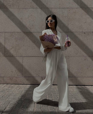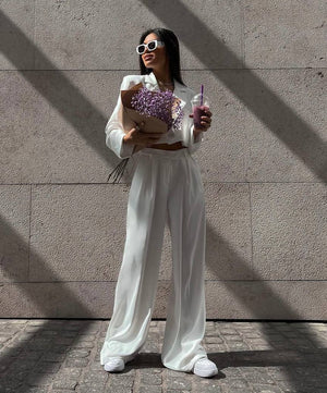 Elegant, modern și impunător, Costumul Amy Alb este alegerea ideală pentru femeile care apreciază stilul sofisticat și minimalismul. Setul este format din sacou scurt, cu un nasture și pantaloni cu talie înaltă și croi larg, care alungesc silueta și oferă o ținută impecabilă.
