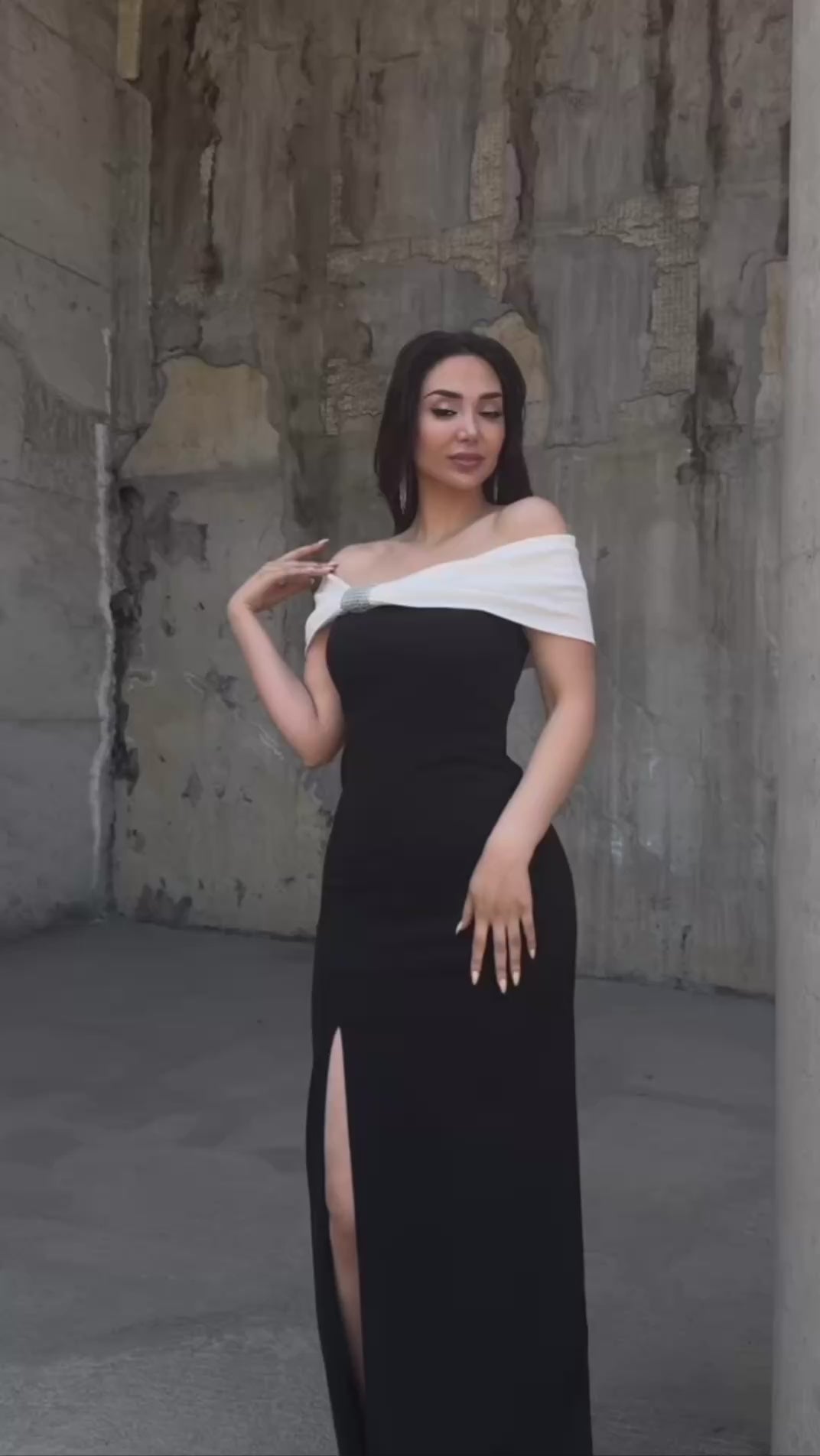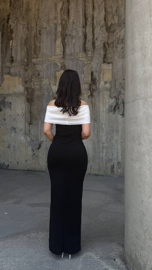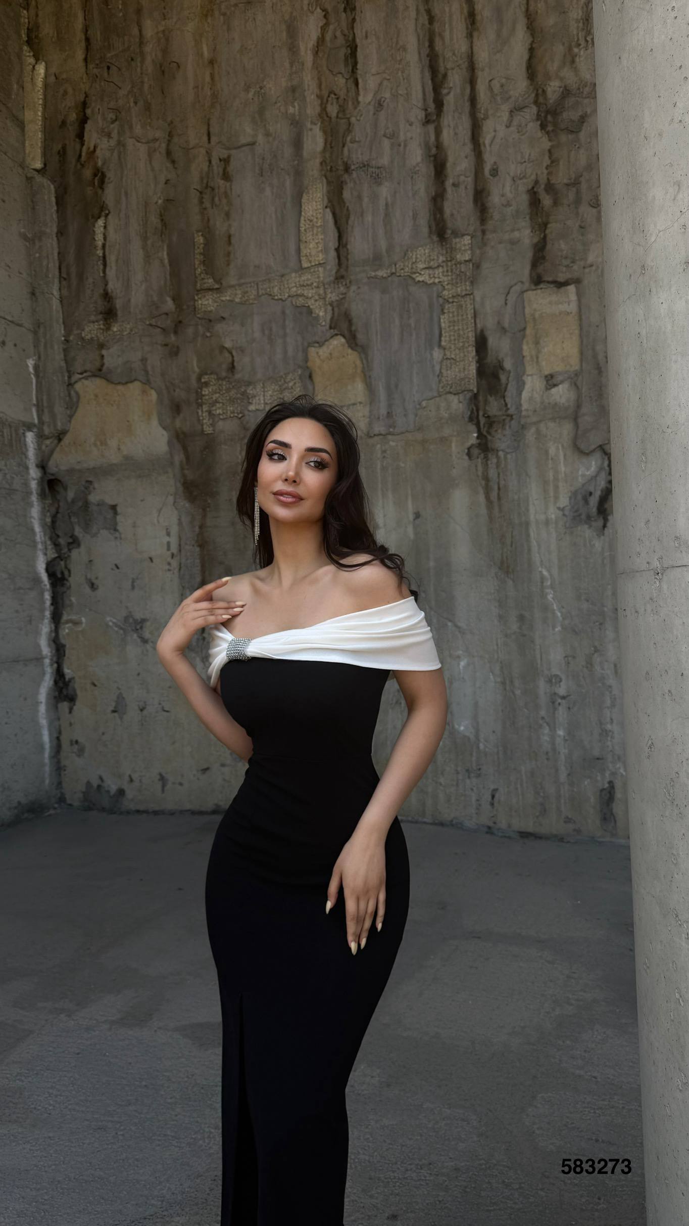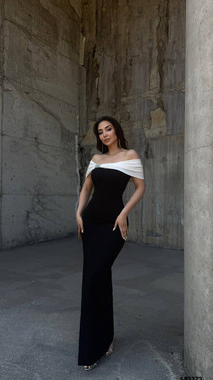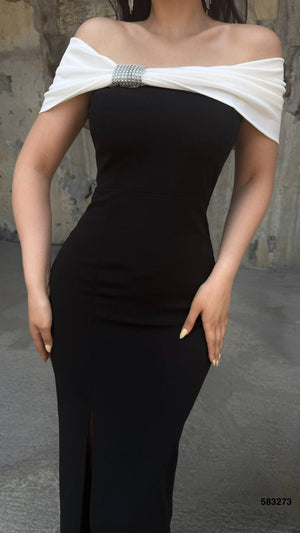 is the perfect choice for events where elegance is essential. Made of a fine material that harmoniously molds to the body, the dress highlights the silhouette in a refined way. The off-shoulder design and contrasting white detail add a sophisticated air, and the front opening offers an extra touch of femininity and style.