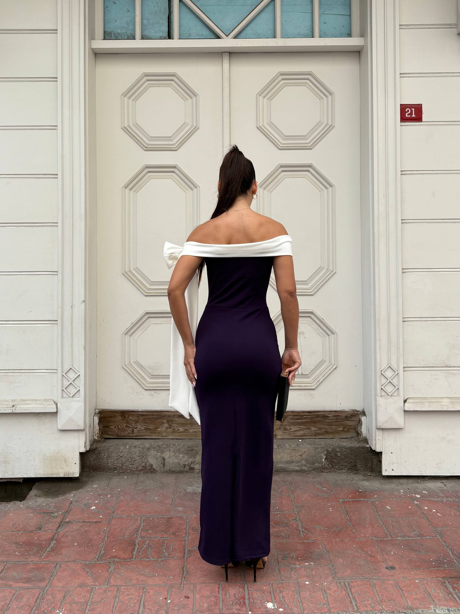 impresses with elegance and refinement. The long, straight cut elongates the silhouette, and the white scarf-like detail on the shoulders provides a delicate and feminine contrast. Perfect for gala evenings, special events or elegant dinners.