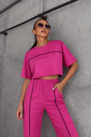 Bluza are o croială lejeră, cu lungimea de 55 cm, oferind libertate de mișcare și un look contemporan. Pantalonii lungi, de 110 cm, au o croială dreaptă care alungește silueta și sunt evidențiați de liniile contrastante subtile, ce adaugă un plus de eleganță și stil.