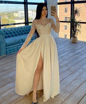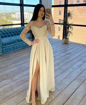 The cut of the dress accentuates the feminine beauty, with an elegant line that flows gracefully on the body, highlighting the waist and creating an attractive silhouette. The sleeves are long. Part of the lace can delicately cover the shoulders or the neckline, offering a subtle air of mystery and femininity.