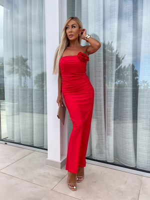 This long sleeveless and off-the-shoulder dress, with a rose applied in the bust area, is ideal for special occasions, balls, weddings or formal events. Its sophisticated design and elegant details will ensure you a special and memorable look, attracting all eyes.