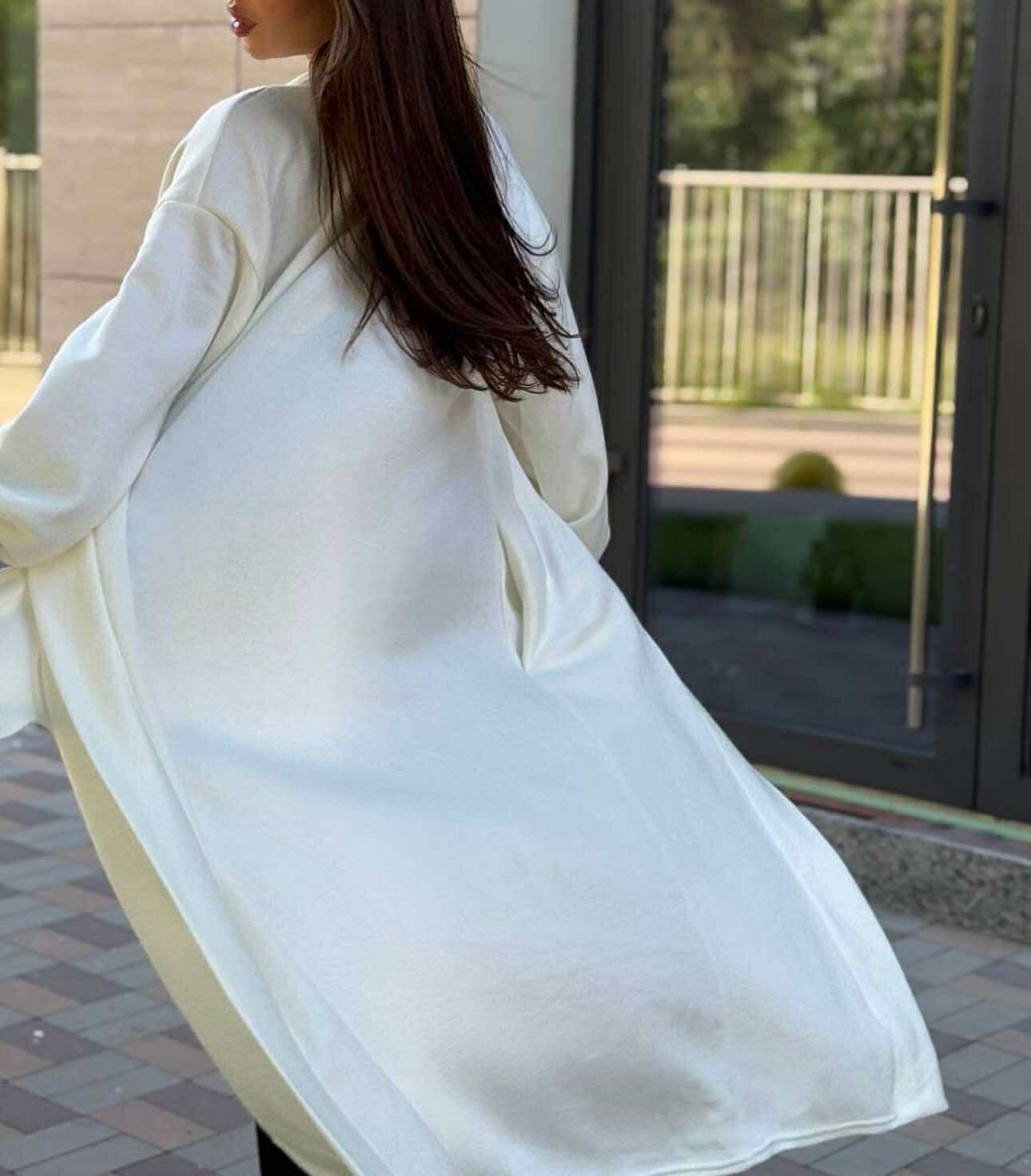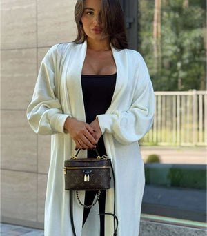 A long cardigan with a drawstring waist, made of a soft and comfortable material, perfect for a chic and relaxed look. The loose cut and slightly puffed sleeves offer a modern and feminine look, and the drawstring highlights the waist, adding balance to the silhouette.