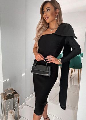 The color of the dress can vary from classic shades such as black or navy blue to brighter or pastel options, depending on preferences and the nature of the event. This dress with one sleeve and bow on the shoulder is perfect for women who want to bring a touch of elegance and sophistication to their appearances.