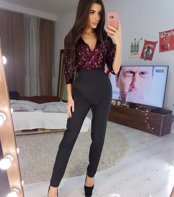 The long jumpsuit made of sequin material with crepe flared pants is a bright and elegant choice for special occasions or festive events. Here is a more detailed description of this jumpsuit:
