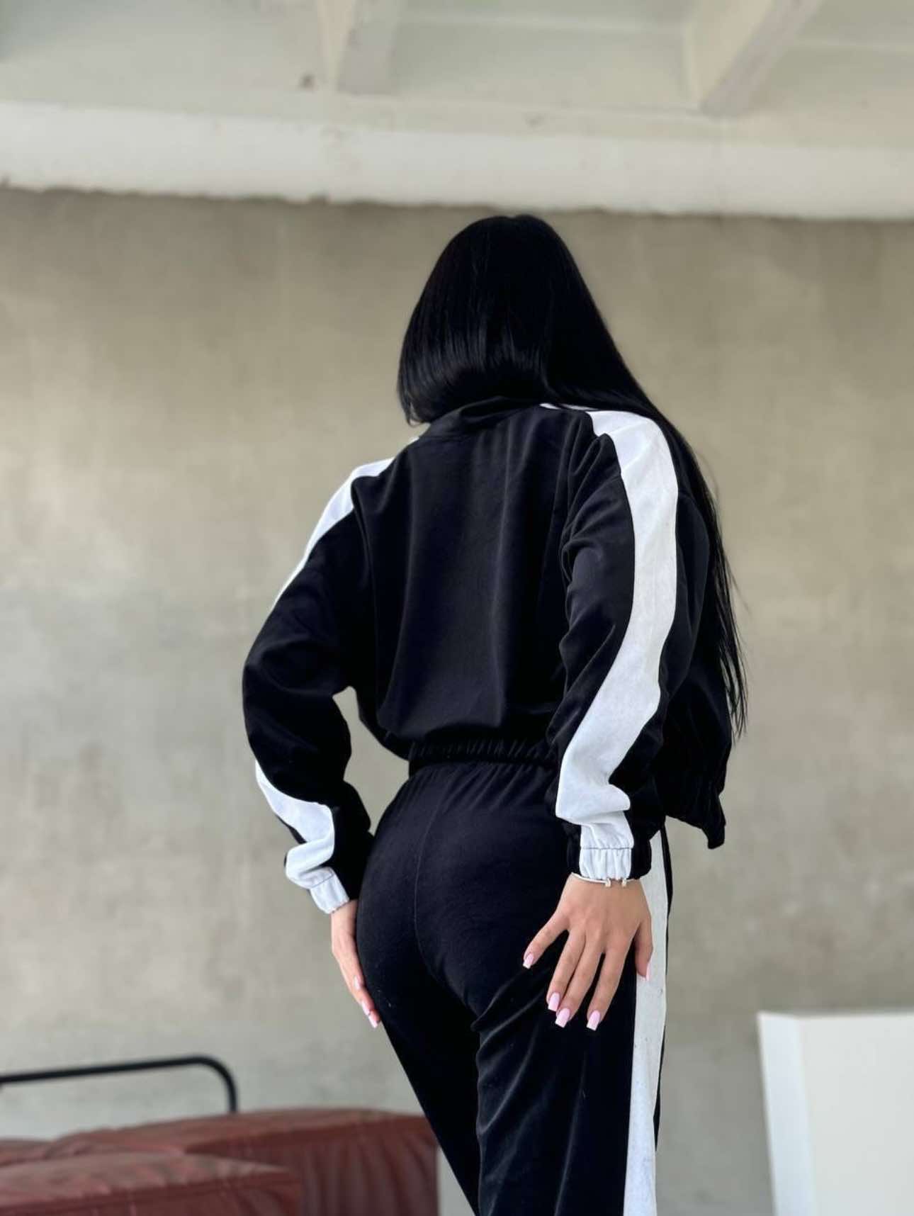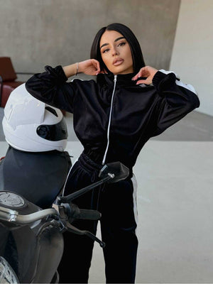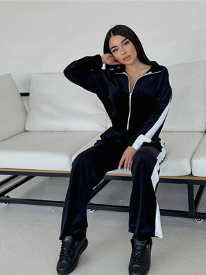 In conclusion, the women's velvet tracksuit with zippered blouse, striped flared pants is a perfect combination of elegance, comfort and modern style. It is an ideal choice for women who want to look good and feel comfortable at the same time, adding a touch of luxury to any day.