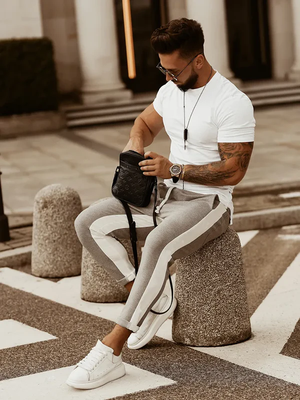 The tracksuit for men with long pants and white side stripes, together with a blouse with short sleeves, is a modern and comfortable choice for sports activities or for relaxing moments. Here is a detailed description of it: