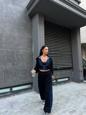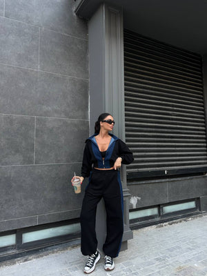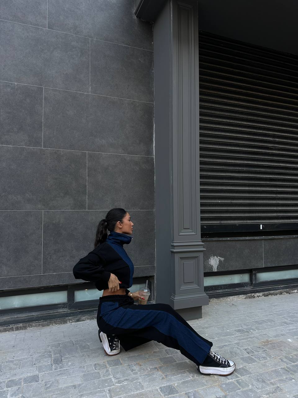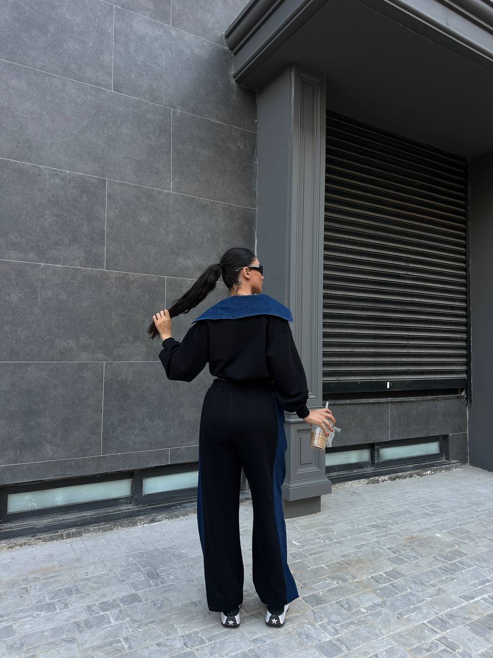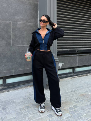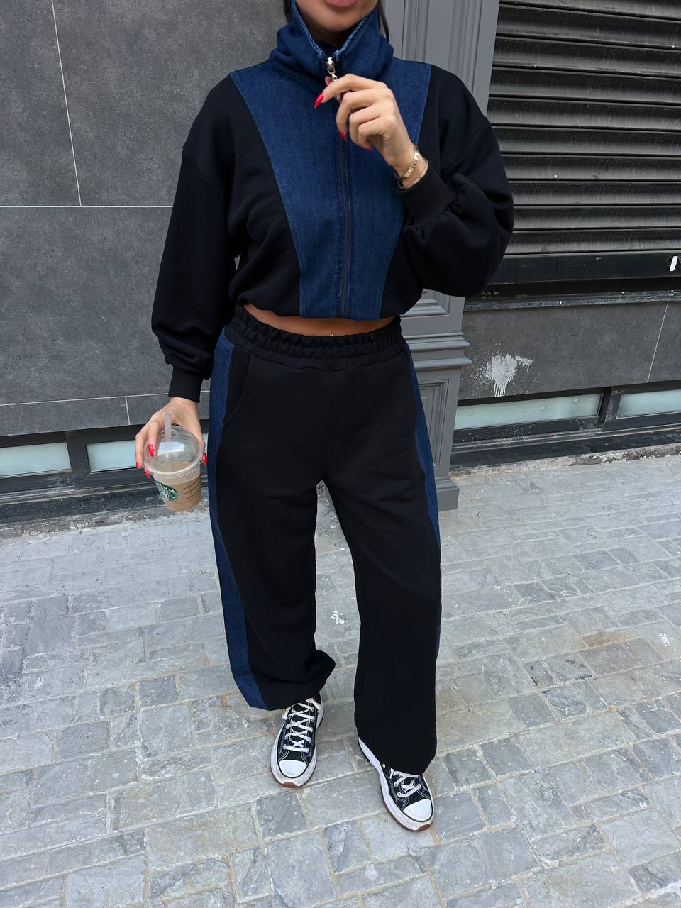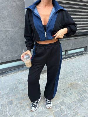 The cropped blouse, with a high collar and a modern cut, is complemented by denim inserts on the front, outlining a feminine and trendy silhouette. The trousers have an elastic waist and a relaxed cut, with a denim side band, offering a cool contrast and a special urban touch.