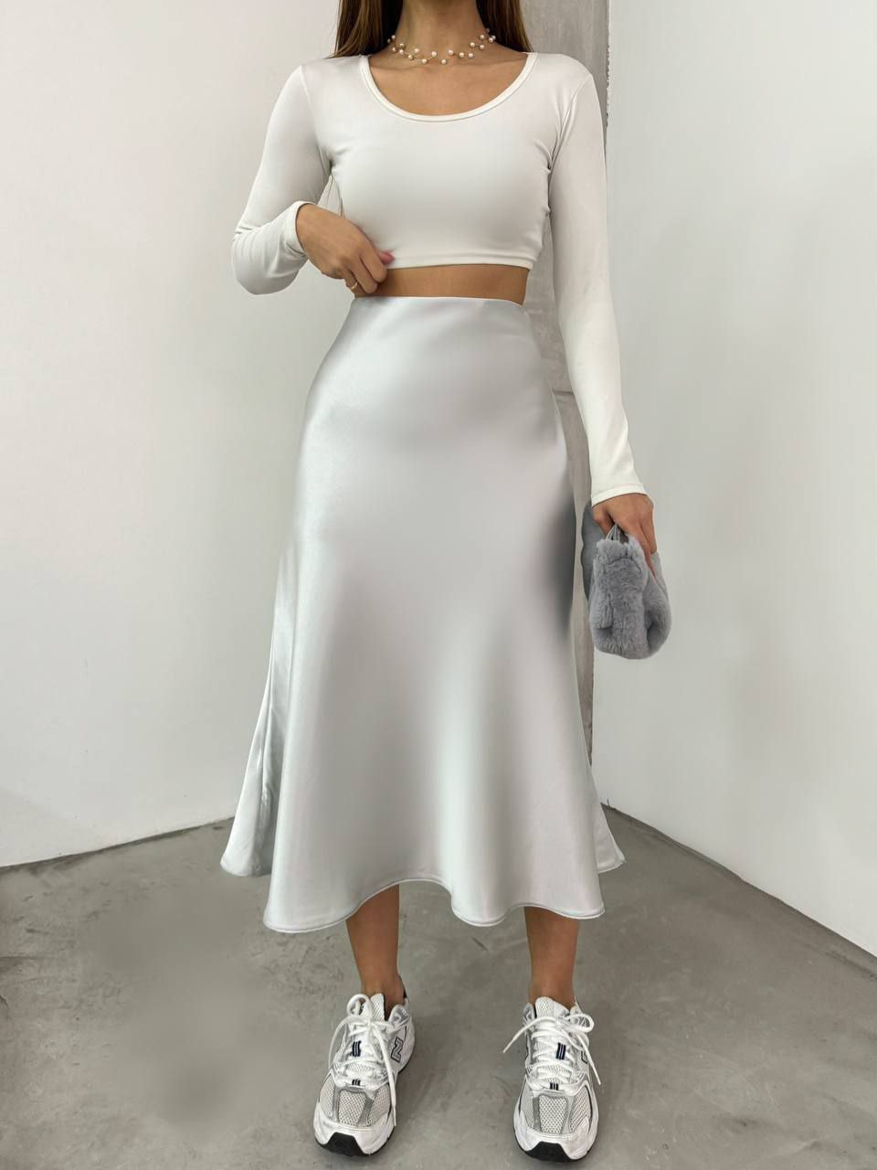 Croiala fustei este midi, ceea ce inseamna ca ajunge pana la jumatatea gambelor, oferind un echilibru perfect intre confort si eleganta. Lungimea midi este extrem de potrivita pentru evenimente formale si casual, permitandu-va sa va miscati liber si sa aratati stilata in acelasi timp.