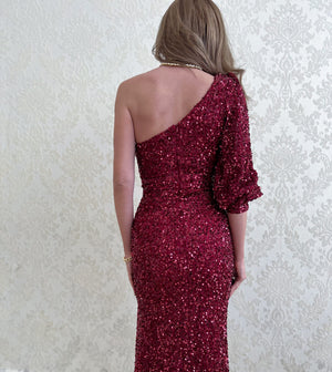 Rochia mulata din lurex cu paiete, cu un design sofisticat ce include un singur umar, o maneca lunga si un decolteu atragator in zona bustului, este o piesa spectaculoasa, perfecta pentru evenimente de seara si ocazii speciale. Cu o crapatura indrazneata pe picior, aceasta rochie combina eleganta clasica cu detalii moderne si senzuale.