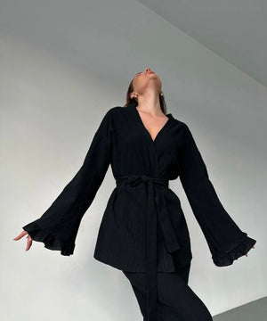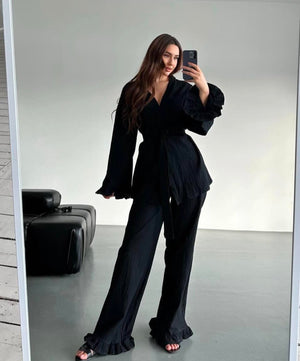 Acest set pentru femei, format din două piese, este combinația perfectă între eleganța fără efort și stilul contemporan, ideal pentru sezonul cald. Ținuta este compusă dintr-o cămașă cu mâneci lungi și o pereche de pantaloni scurți, oferind un look echilibrat și versatil, perfect pentru plimbări prin oraș, ieșiri casual sau vacanțe.