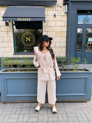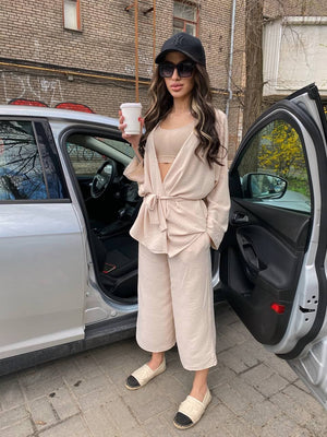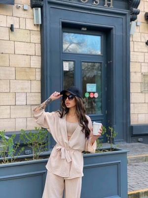 Acest set pentru femei, format din două piese, este combinația perfectă între eleganța fără efort și stilul contemporan, ideal pentru sezonul cald. Ținuta este compusă dintr-un cardigan cu mâneci lungi și o pereche de pantaloni midi, oferind un look echilibrat și versatil, perfect pentru plimbări prin oraș, ieșiri casual sau vacanțe.