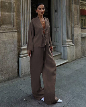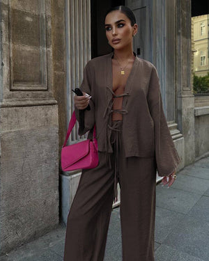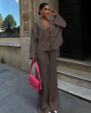 Acest set pentru femei, format din două piese, este alegerea ideală pentru un look elegant, modern și versatil. Compus dintr-o cămașă cu mâneci lungi și o pereche de pantaloni, acest outfit oferă echilibrul perfect între confort și rafinament, într-un mod stilat și fără efort.