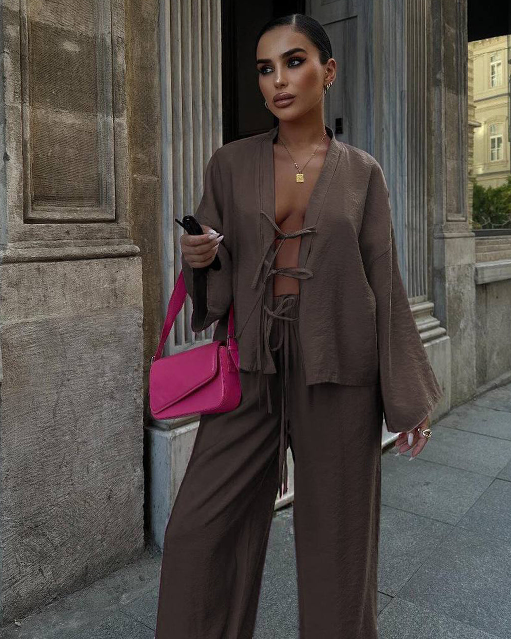 Realizat din materiale moi, ușoare sau cu o textură delicată, acest ansamblu este perfect pentru sezonul cald, dar poate fi purtat și confortabil în perioadele de tranziție. Asortează-l cu pantofi cu toc sau încălțăminte comodă, o geantă structurată și accesorii minimaliste pentru o ținută impecabilă, feminină și modernă.