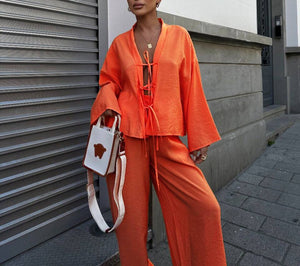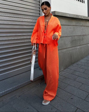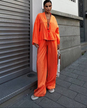 Acest set pentru femei, format din două piese, este alegerea ideală pentru un look elegant, modern și versatil. Compus dintr-o cămașă cu mâneci lungi și o pereche de pantaloni, acest outfit oferă echilibrul perfect între confort și rafinament, într-un mod stilat și fără efort.