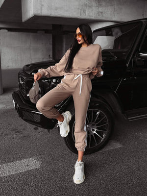 **Pentru ea**, treningul poate include o bluza , alaturi de pantaloni cu o croiala fie lejera, fie usor evazata, care ofera o alungire subtila a siluetei. Bluza poate avea detalii delicate, cum ar fi o dunga contrastanta, ce adauga o nota feminina si stilata.