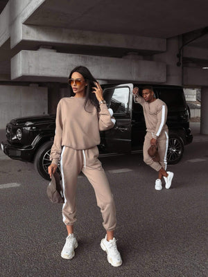 **Pentru el**, setul poate include o bluza , in stil sportiv, si pantaloni usor conici, care ofera un look modern si masculin. Detaliile minimaliste, precum dungile laterale , completeaza un look deosebit si stilat.