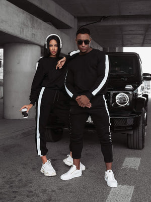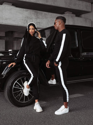 **Pentru el**, setul poate include o bluza , in stil sportiv, si pantaloni usor conici, care ofera un look modern si masculin. Detaliile minimaliste, precum dungile laterale , completeaza un look deosebit si stilat.