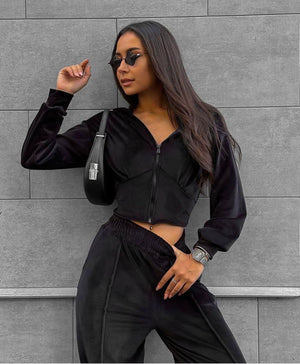 Treningul de dama din catifea, compus din bluza cu fermoar si pantaloni lungi evazati, este o alegere deosebit de eleganta si confortabila, perfecta pentru femeile care doresc sa imbine luxul cu un stil modern si functional. Aceasta tinuta iese in evidenta prin detalii atent realizate si un design care atrage privirile.