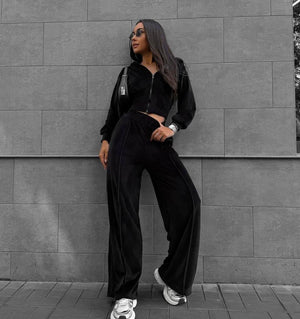 Talia elastica sau ajustabila prin snur asigura o potrivire confortabila si flexibila, facand acest trening perfect pentru diverse activitati, de la plimbari relaxate pana la intalniri casual. Materialul din catifea pastreaza caldura si confortul, fiind ideal pentru zilele mai racoroase sau pentru a adauga un strop de lux oricarui moment al zilei.