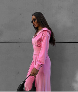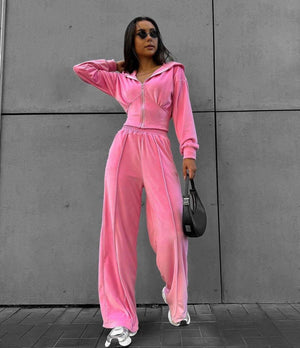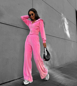 Talia elastica sau ajustabila prin snur asigura o potrivire confortabila si flexibila, facand acest trening perfect pentru diverse activitati, de la plimbari relaxate pana la intalniri casual. Materialul din catifea pastreaza caldura si confortul, fiind ideal pentru zilele mai racoroase sau pentru a adauga un strop de lux oricarui moment al zilei.