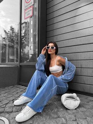 **Pantalonii lungi evazati din catifea** completeaza perfect bluza, adaugand eleganta si fluiditate siluetei. Croiala evazata alungeste si subtiaza picioarele, creand un efect vizual atragator. Dungile aplicate pe lateralele pantalonilor ofera un accent de stil si continuitate, legand designul intregii tinute.