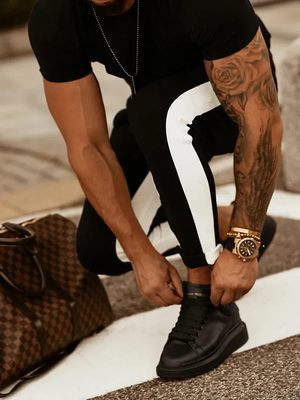 Treningul pentru barbati cu pantaloni lungi si dungi albe laterale, impreuna cu o bluza cu maneci scurte, este o alegere moderna si confortabila pentru activitatile sportive sau pentru momentele relaxante. Iata o descriere detaliata a acestuia: