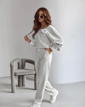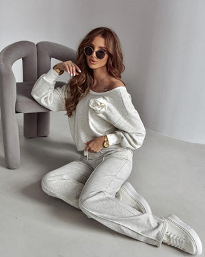 **Bluza** din set are o croiala lejera, care asigura confort si libertate de miscare. Realizata dintr-un material moale si placut la atingere, bluza este ideala pentru purtarea de zi cu zi. Elementul care atrage atentia este **trandafirul aplicat** pe partea frontala, un detaliu romantic si elegant, care ofera un accent subtil si feminin. Acest trandafir adauga un plus de rafinament si transforma o piesa simpla intr-una deosebita, ideala pentru a-ti exprima personalitatea si stilul.