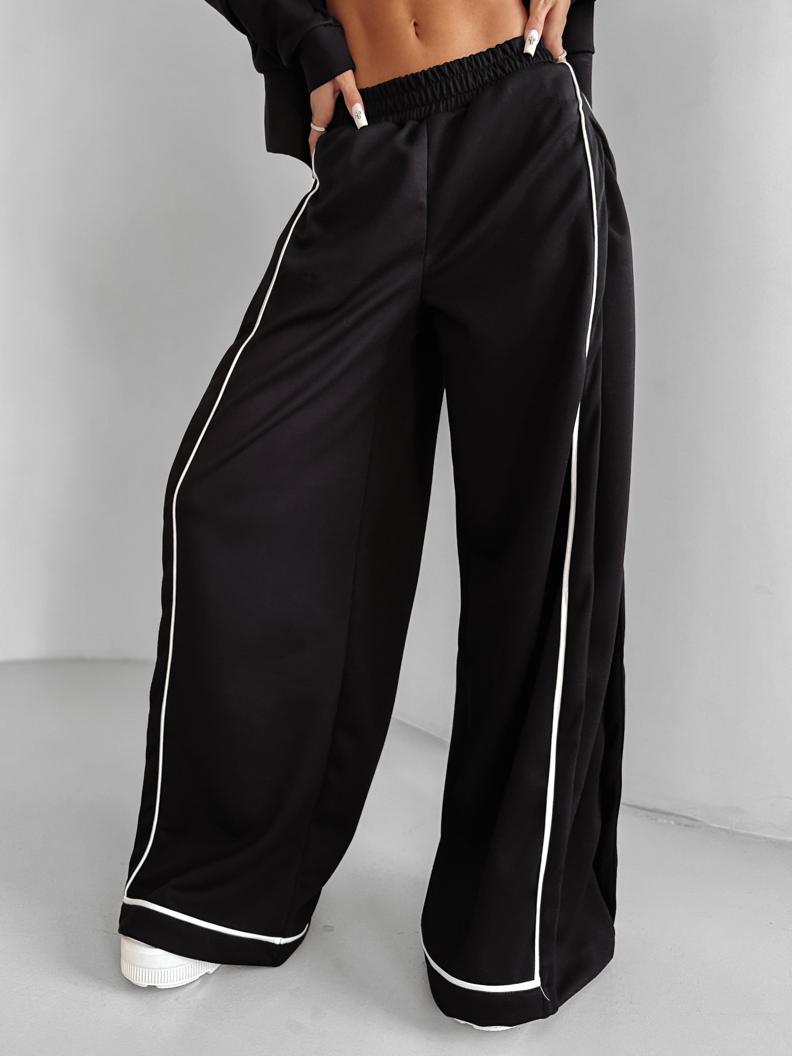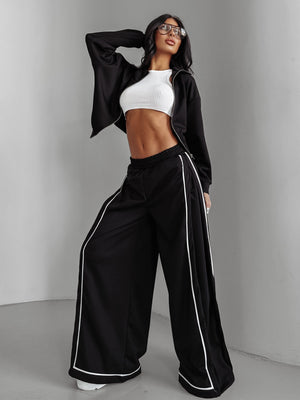Realizat dintr-un material de calitate, moale și plăcut la atingere, acest trening este alegerea perfectă pentru ținutele casual sau sport-chic. Bluza are un croi modern, scurt, cu fermoar metalic și guler înalt, oferind un look stylish și comod. Pantalonii cu talie elastică și croi larg, evidențiați de dunga albă contrastantă, adaugă un plus de lejeritate și rafinament.