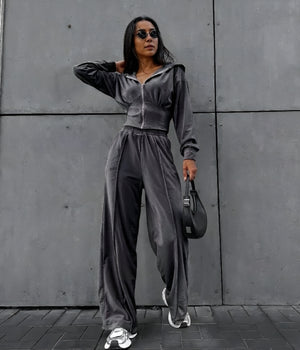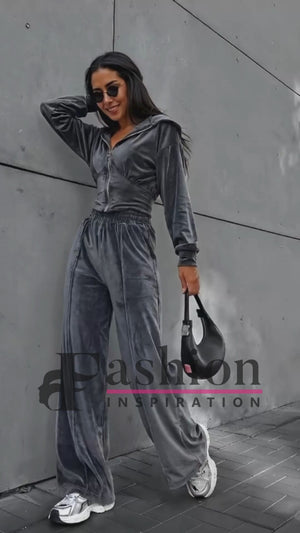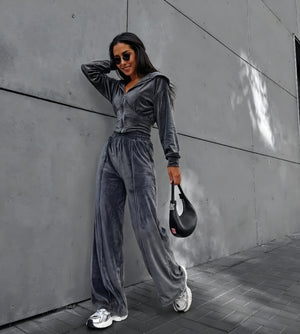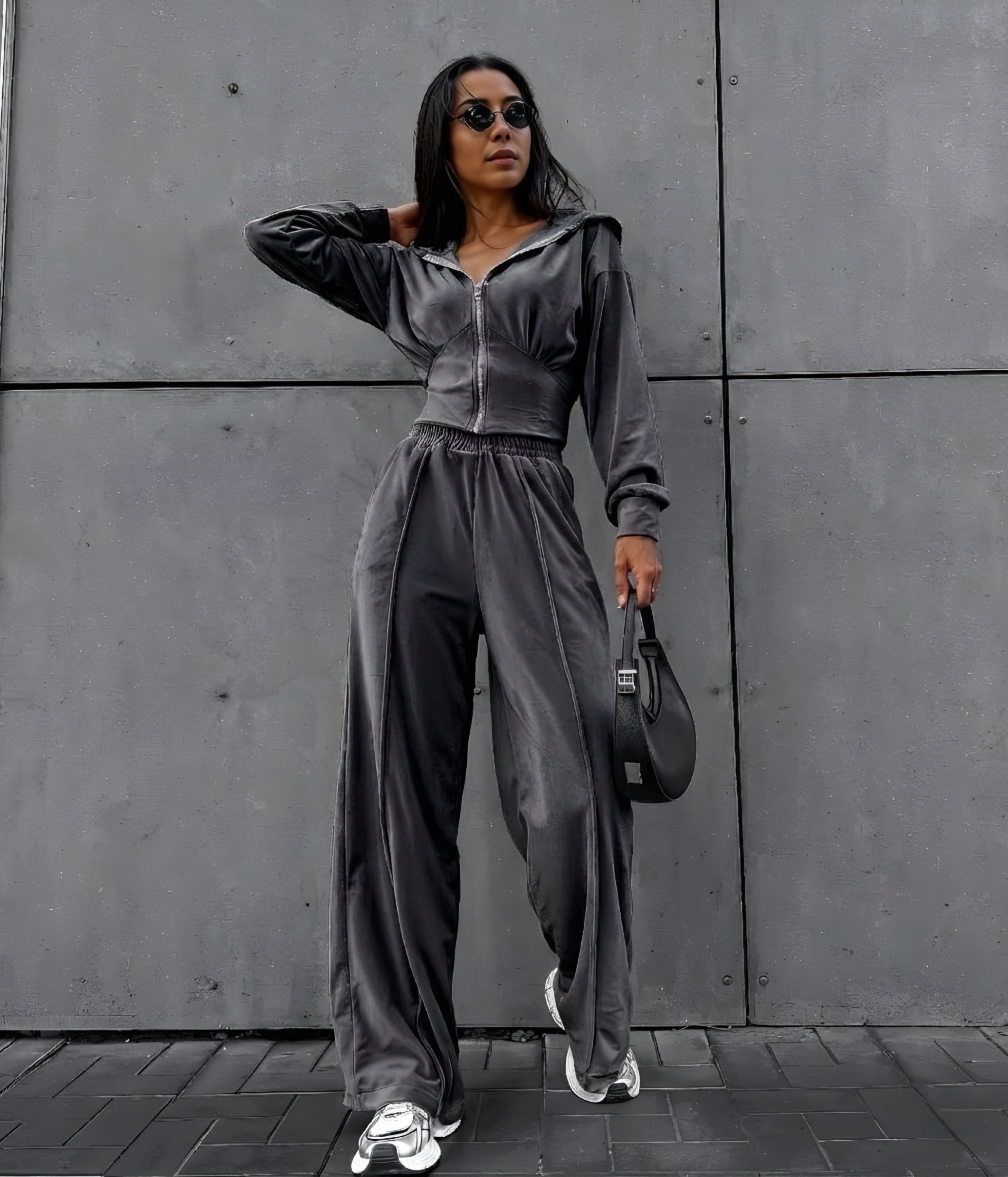 Talia elastica sau ajustabila prin snur asigura o potrivire confortabila si flexibila, facand acest trening perfect pentru diverse activitati, de la plimbari relaxate pana la intalniri casual. Materialul din catifea pastreaza caldura si confortul, fiind ideal pentru zilele mai racoroase sau pentru a adauga un strop de lux oricarui moment al zilei.