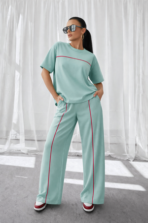 Bluza are un croi lejer, cu mânecă scurtă și design minimalist, evidențiat de un detaliu contrastant discret pe linia pieptului, care adaugă personalitate ținutei. Pantalonii sunt lungi, cu croi larg și linie contrastantă pe laterale, alungind vizual silueta și oferind un aspect modern și stilizat.