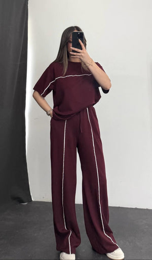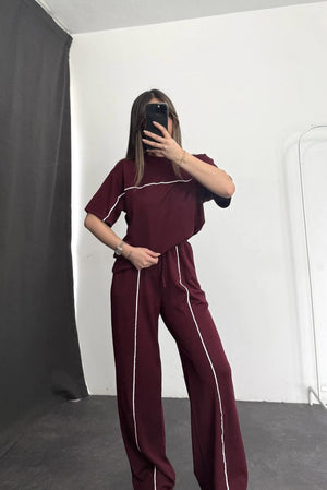 **Pantalonii lungi evazati ** completeaza perfect bluza, adaugand eleganta si fluiditate siluetei. Croiala evazata alungeste si subtiaza picioarele, creand un efect vizual atragator. Dungile aplicate pe lateralele pantalonilor ofera un accent de stil si continuitate, legand designul intregii tinute.