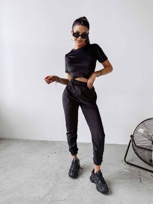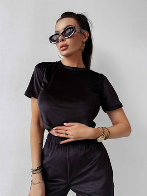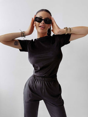 Treningul din catifea de dama, compus din bluza cu maneca scurta si pantaloni lungi, este o alegere sofisticata si confortabila pentru momentele in care doresti sa te simti eleganta, dar relaxata. Realizat dintr-un material catifelat, acest trening ofera o senzatie placuta la atingere si o stralucire subtila, aducand un plus de lux tinutei casual.