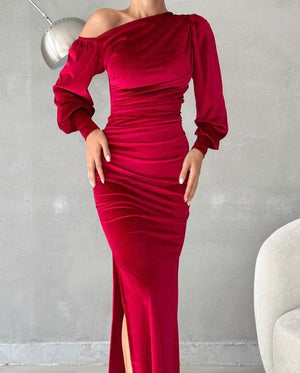 Rochia lunga din catifea, potrivita pentru ocazii speciale si mulata pe corp, emana eleganta si rafinament. Iata o descriere detaliata a acestei rochii: