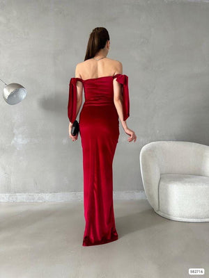 Rochia lunga din catifea, potrivita pentru ocazii speciale si mulata pe corp, emana eleganta si rafinament. Iata o descriere detaliata a acestei rochii: