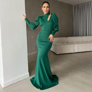 Aceasta rochie lunga, mulata, cu maneci lungi si trena este o alegere fermecatoare pentru femeile care doresc sa impresioneze la evenimente deosebite. Accesorizata cu atentie, cum ar fi o poseta stralucitoare si bijuterii elegante, aceasta rochie va oferi o prezenta de neuitat.