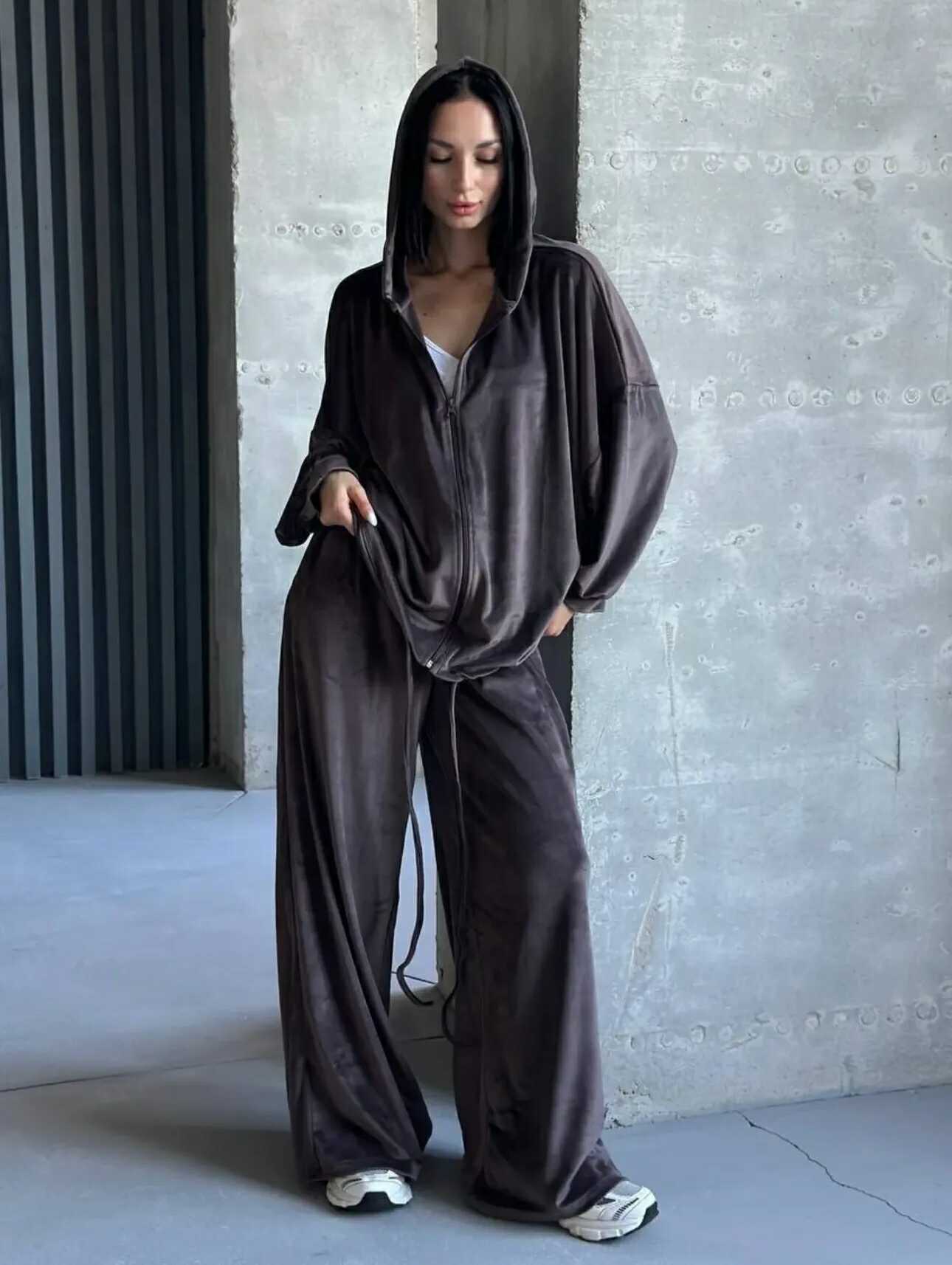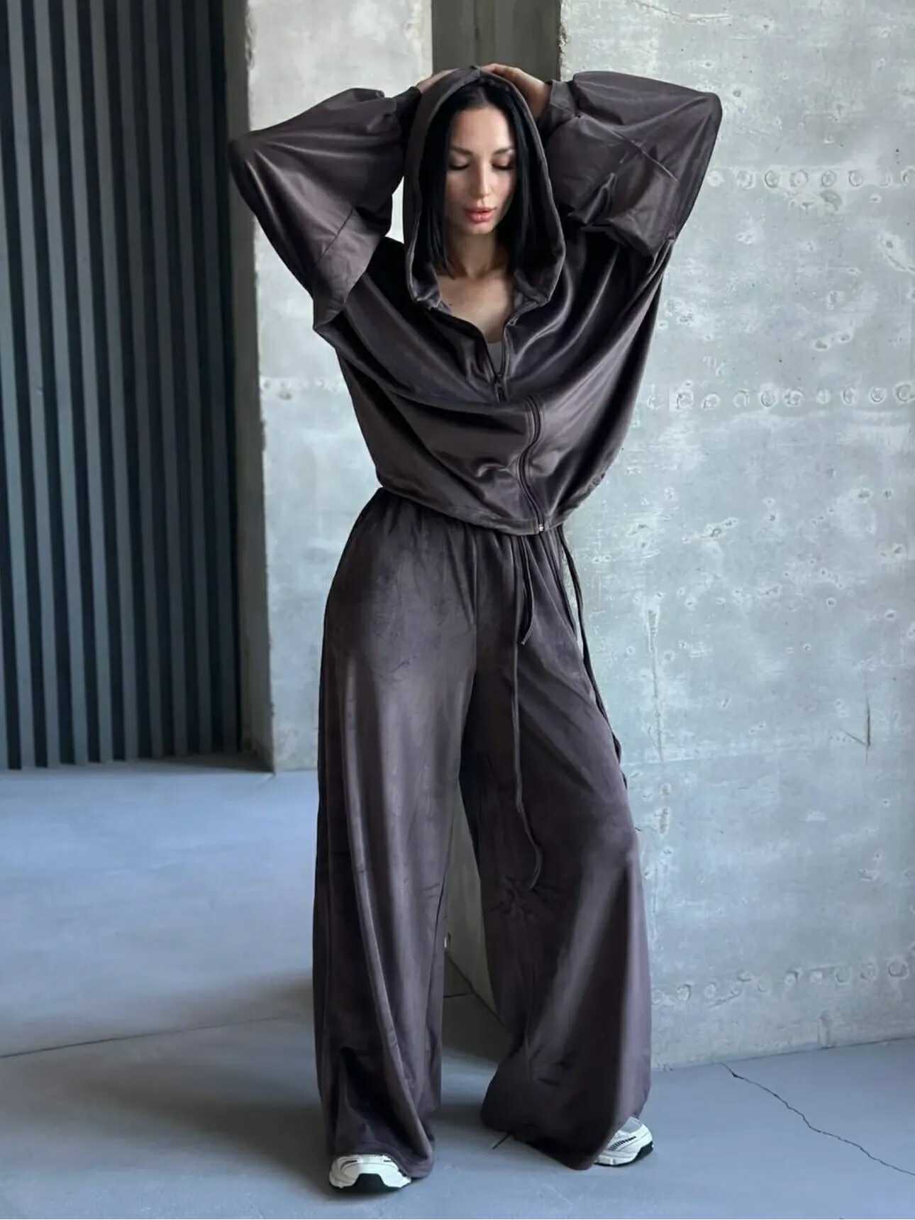 Trening Fina  îmbină un look modern cu un nivel ridicat de confort. Conceput din material catifelat, moale și plăcut la atingere, oferă o senzație luxoasă și un aspect elegant chiar și în ținutele casual. Bluza cu fermoar și croi lejer evidențiază talia într-un mod feminin, iar pantalonii largi asigură libertate de mișcare și un efect relaxat & stylish.