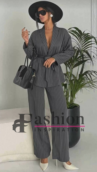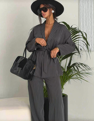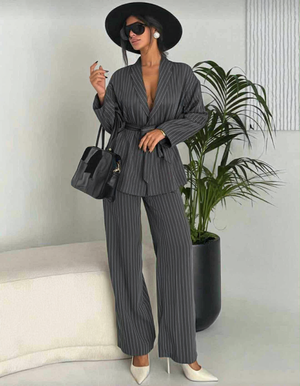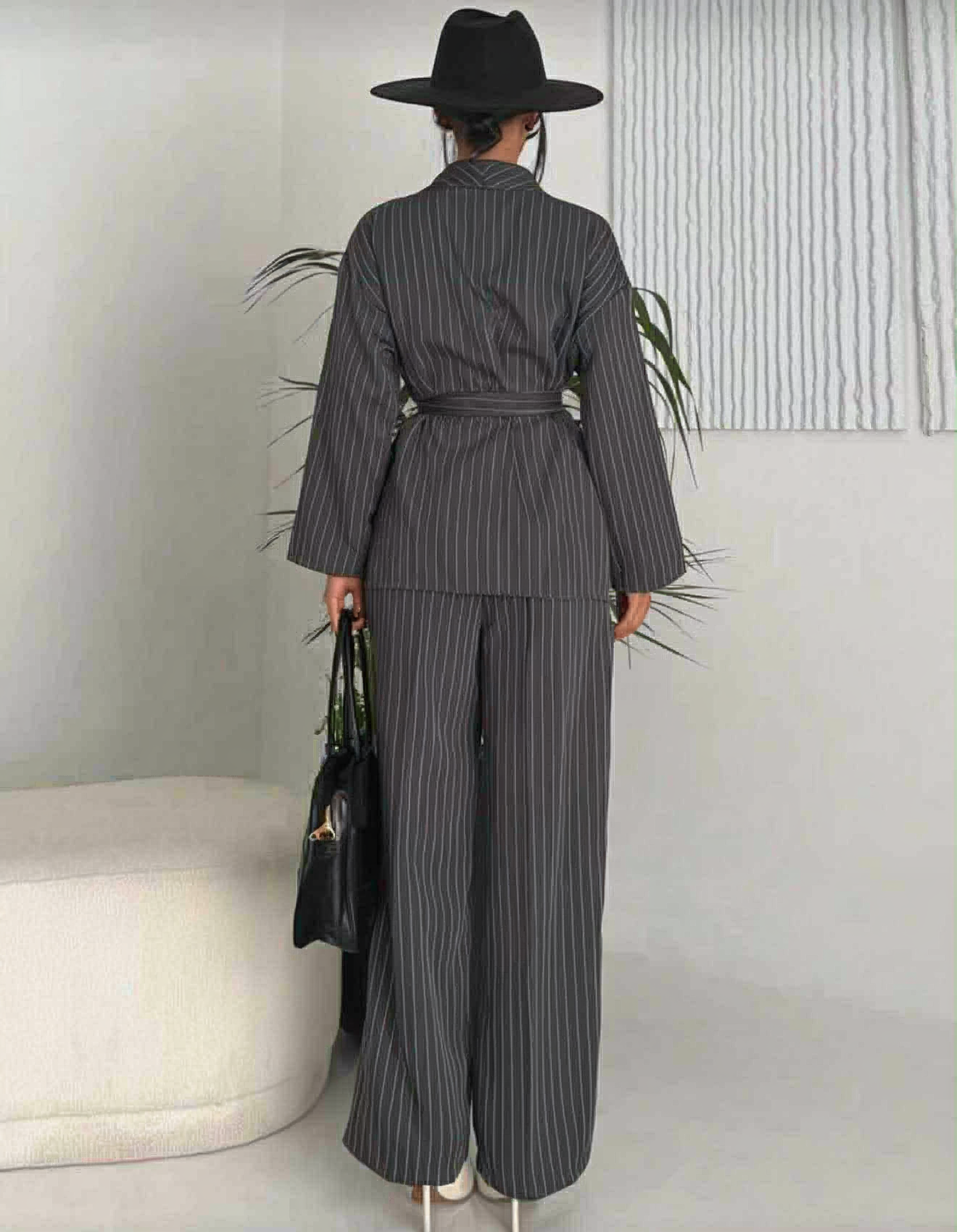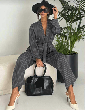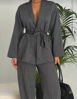 Costum elegant din două piese, realizat din material textil de calitate superioară, cu dungi fine verticale. Țesătura este plăcută la atingere, ușor structurată, oferind un aspect rafinat și bine definit. Materialul are o ținută frumoasă, nu se șifonează ușor și asigură confort la purtare pe tot parcursul zilei.