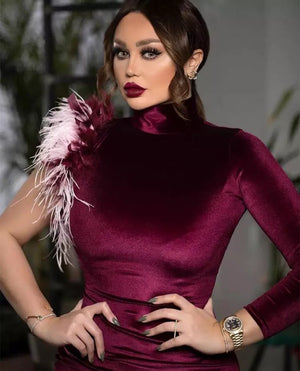 Aceasta rochie mulata midi din catifea, fara maneci, cu guler si pene aplicate pe un umar este perfecta pentru petreceri, cocktail-uri, evenimente speciale sau serate elegante. Designul sau elegant si sofisticat va va face sa va simtiti fermecatoare si pline de stil in fiecare moment.