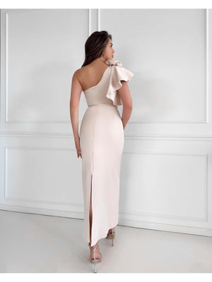 Aceasta rochie lunga mulata cu un umar, un volan si un trandafir aplicat pe umar este ideala pentru evenimente formale si ocazii speciale. Designul sau sofisticat si detaliile romantice va vor asigura un look deosebit si memorabil, atragand toate privirile.