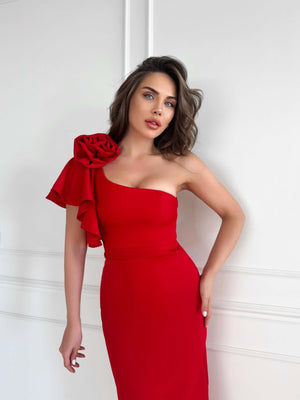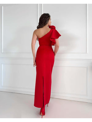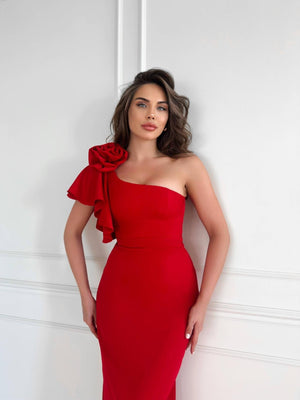 Aceasta rochie lunga mulata cu un umar, un volan si un trandafir aplicat pe umar este ideala pentru evenimente formale si ocazii speciale. Designul sau sofisticat si detaliile romantice va vor asigura un look deosebit si memorabil, atragand toate privirile.