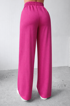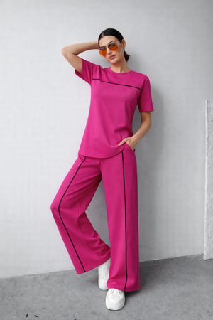 Bluza are un croi lejer, cu mânecă scurtă și design minimalist, evidențiat de un detaliu contrastant discret pe linia pieptului, care adaugă personalitate ținutei. Pantalonii sunt lungi, cu croi larg și linie contrastantă pe laterale, alungind vizual silueta și oferind un aspect modern și stilizat.