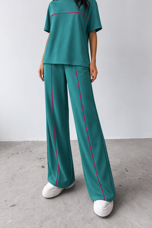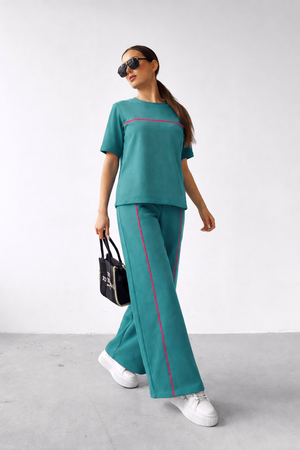 Bluza are un croi lejer, cu mânecă scurtă și design minimalist, evidențiat de un detaliu contrastant discret pe linia pieptului, care adaugă personalitate ținutei. Pantalonii sunt lungi, cu croi larg și linie contrastantă pe laterale, alungind vizual silueta și oferind un aspect modern și stilizat.