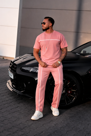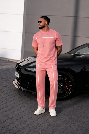 Designul este evidențiat de liniile albe discrete, care adaugă un plus de stil și eleganță ținutei. Tricoul are o croială lejeră, care se așază foarte bine pe corp, iar pantalonii sunt creați pentru a oferi libertate de mișcare și confort pe tot parcursul zilei.