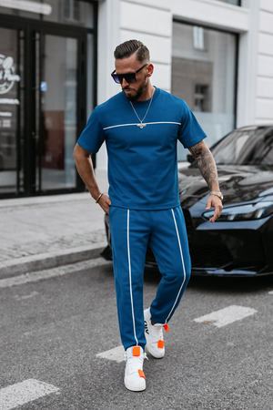 Designul este evidențiat de liniile albe discrete, care adaugă un plus de stil și eleganță ținutei. Tricoul are o croială lejeră, care se așază foarte bine pe corp, iar pantalonii sunt creați pentru a oferi libertate de mișcare și confort pe tot parcursul zilei.